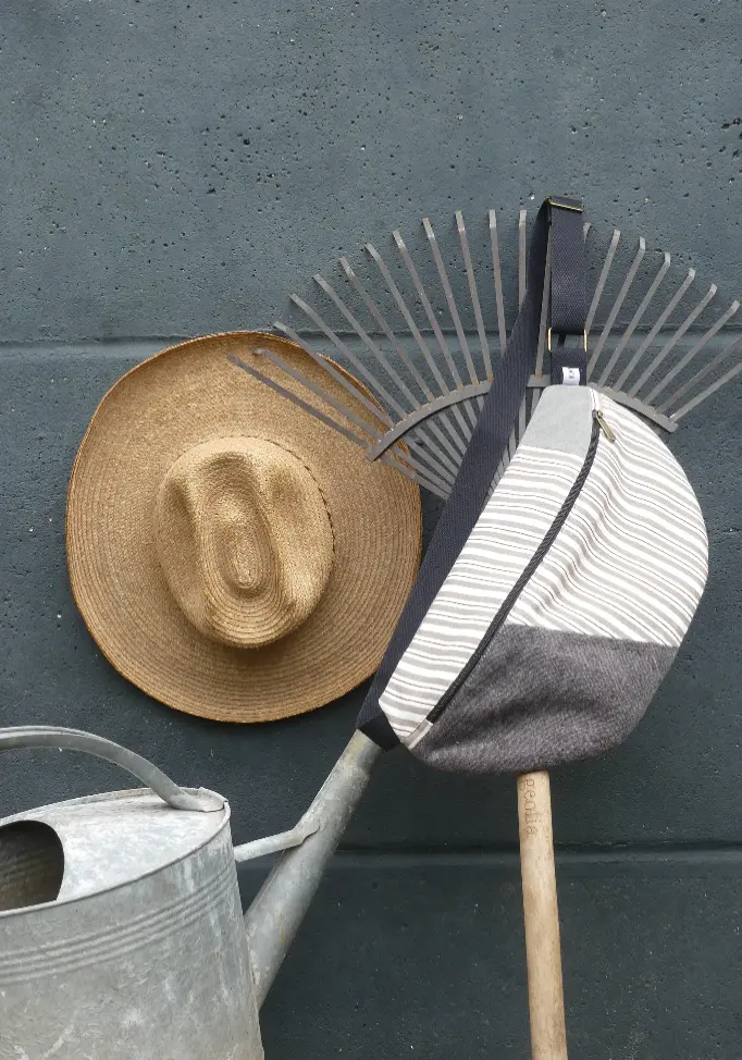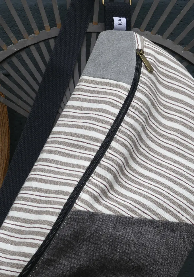 Grand sac banane en tissu type toile à matelas issu de collection de tissus déco revalorisés.