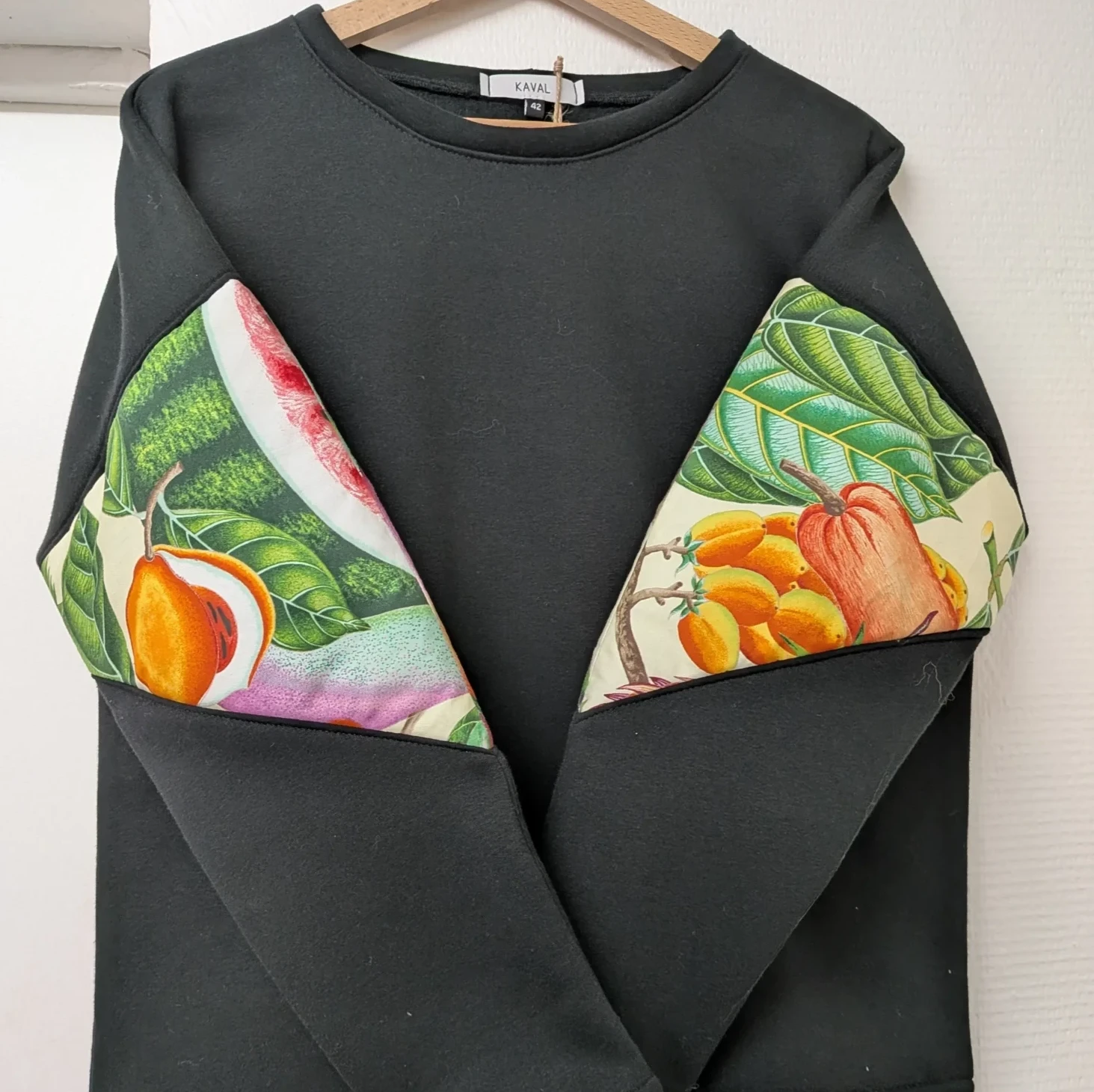 Sweat noir hyper confortable, douillet et ultra chic avec ses empiècements de tissu upcyclé au niveau des manches.